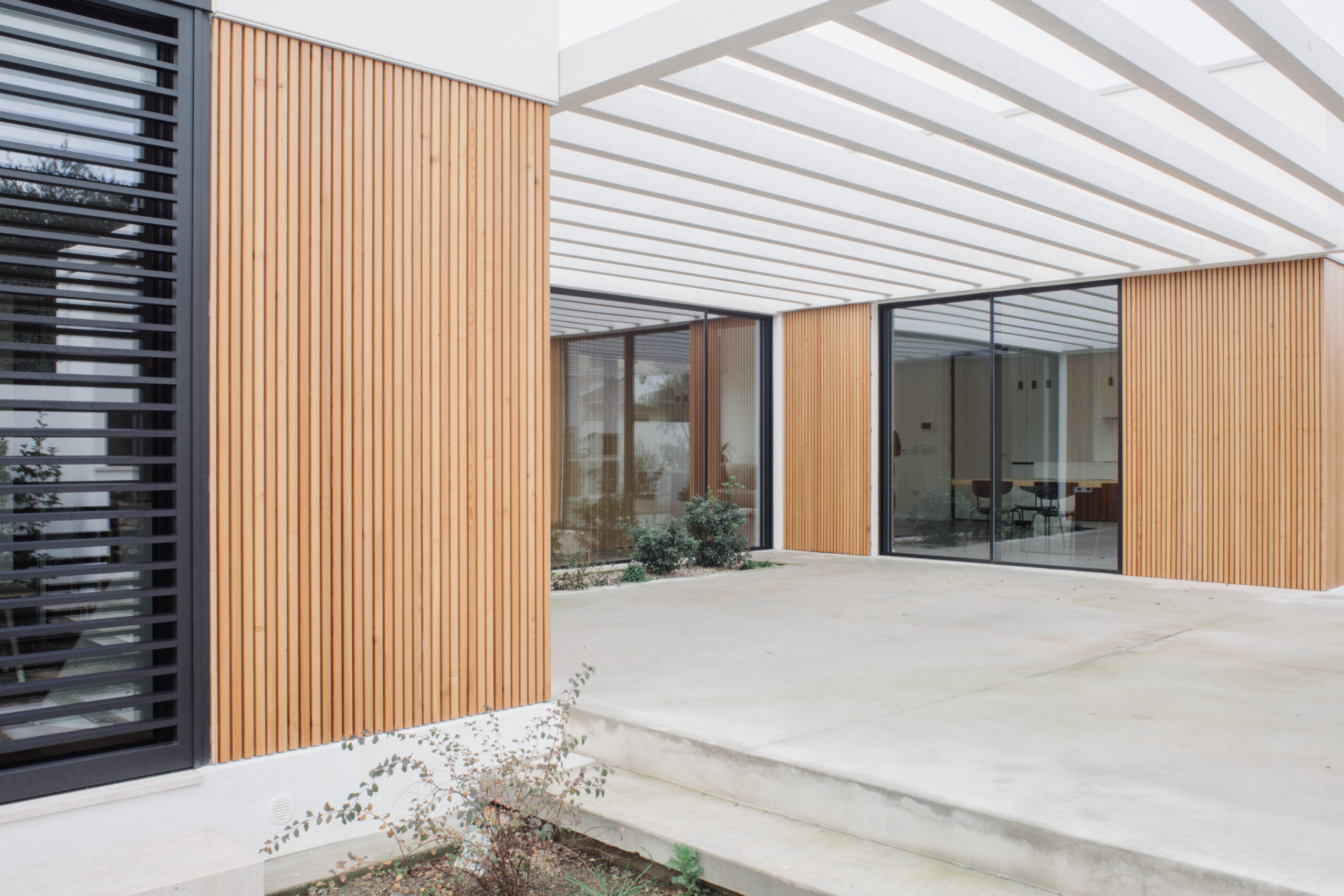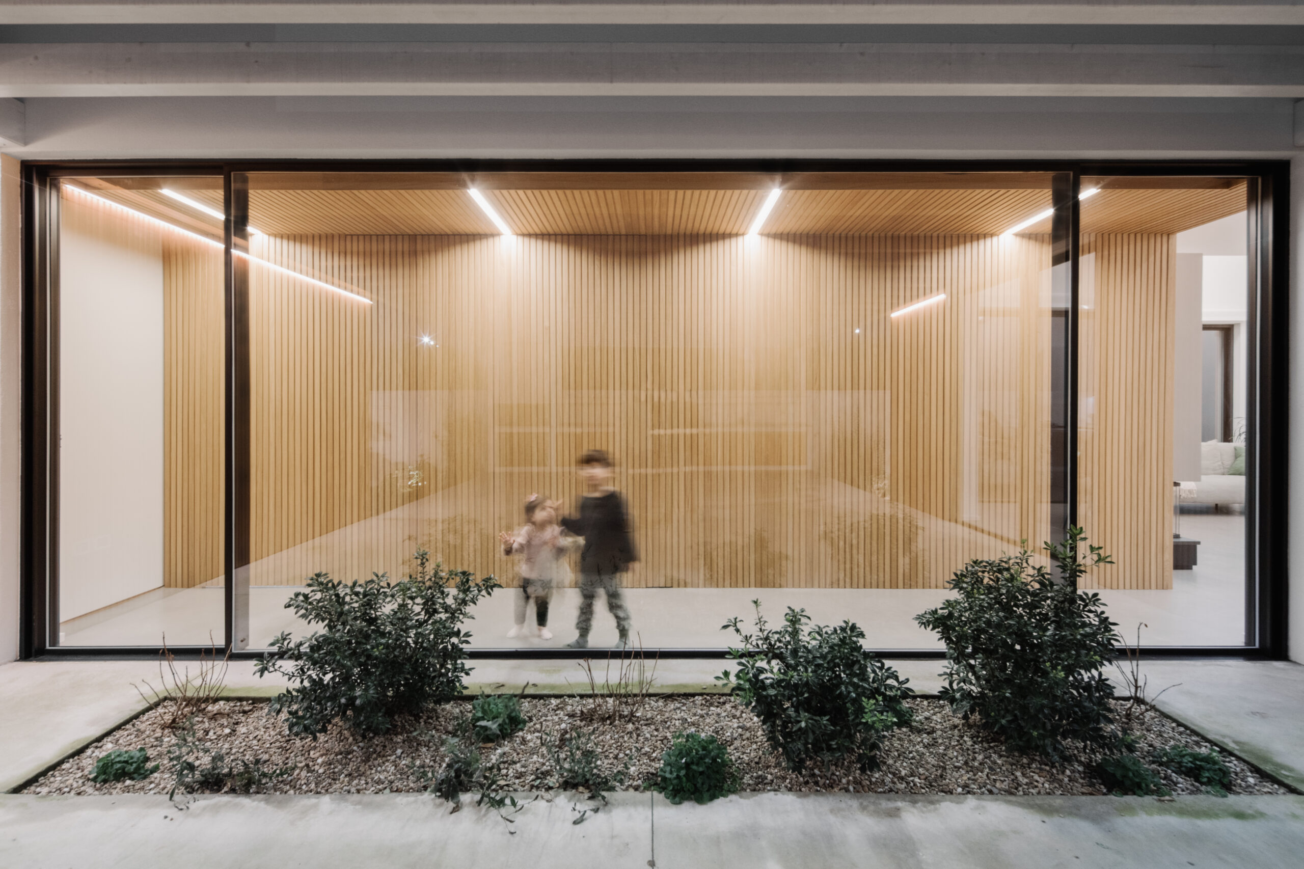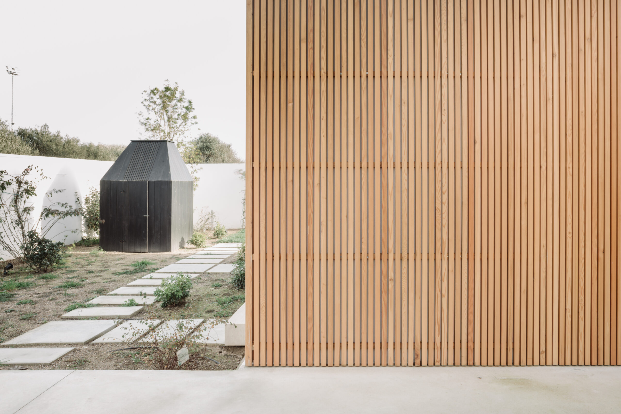 Per gli spazi esterni, la casa è rivestita da circa 1000 listelli di Larice.