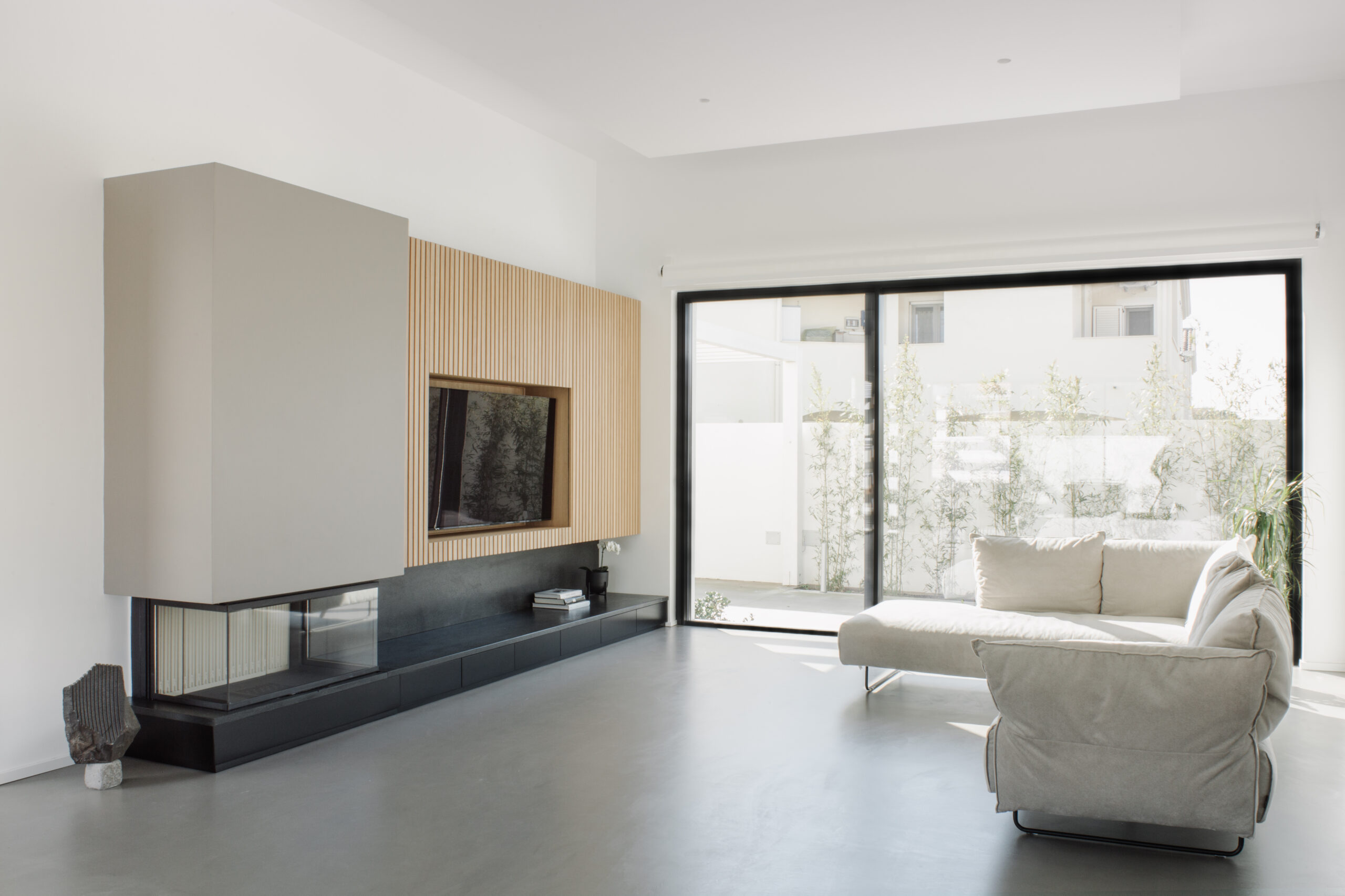 Nella zona living abbiamo realizzato una parete contenitiva su misura, con parte alta sospesa, parte centrale con nicchia Tv e parte bassa con cassettoni apribili mediante sistema push pull e cammino integrato.