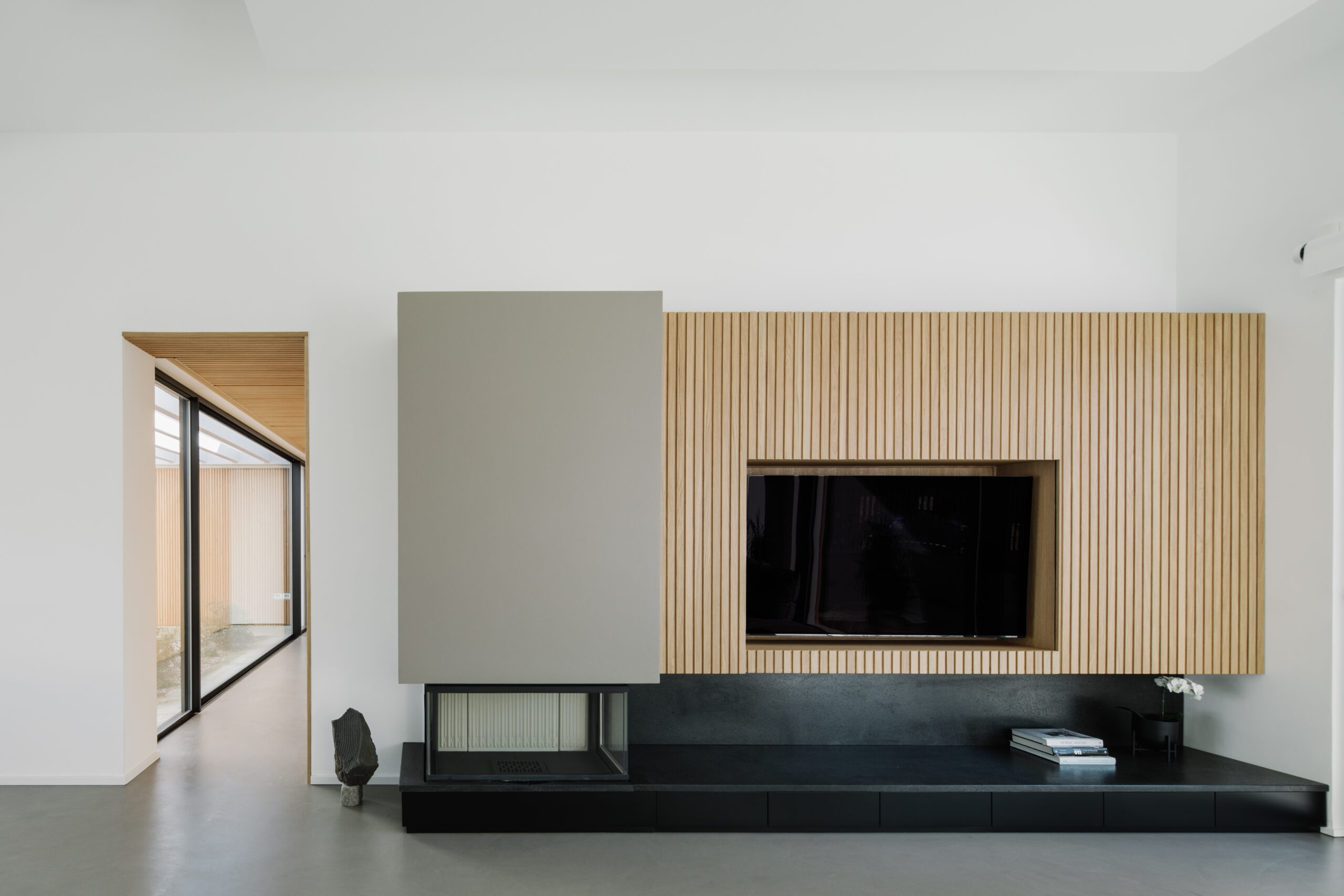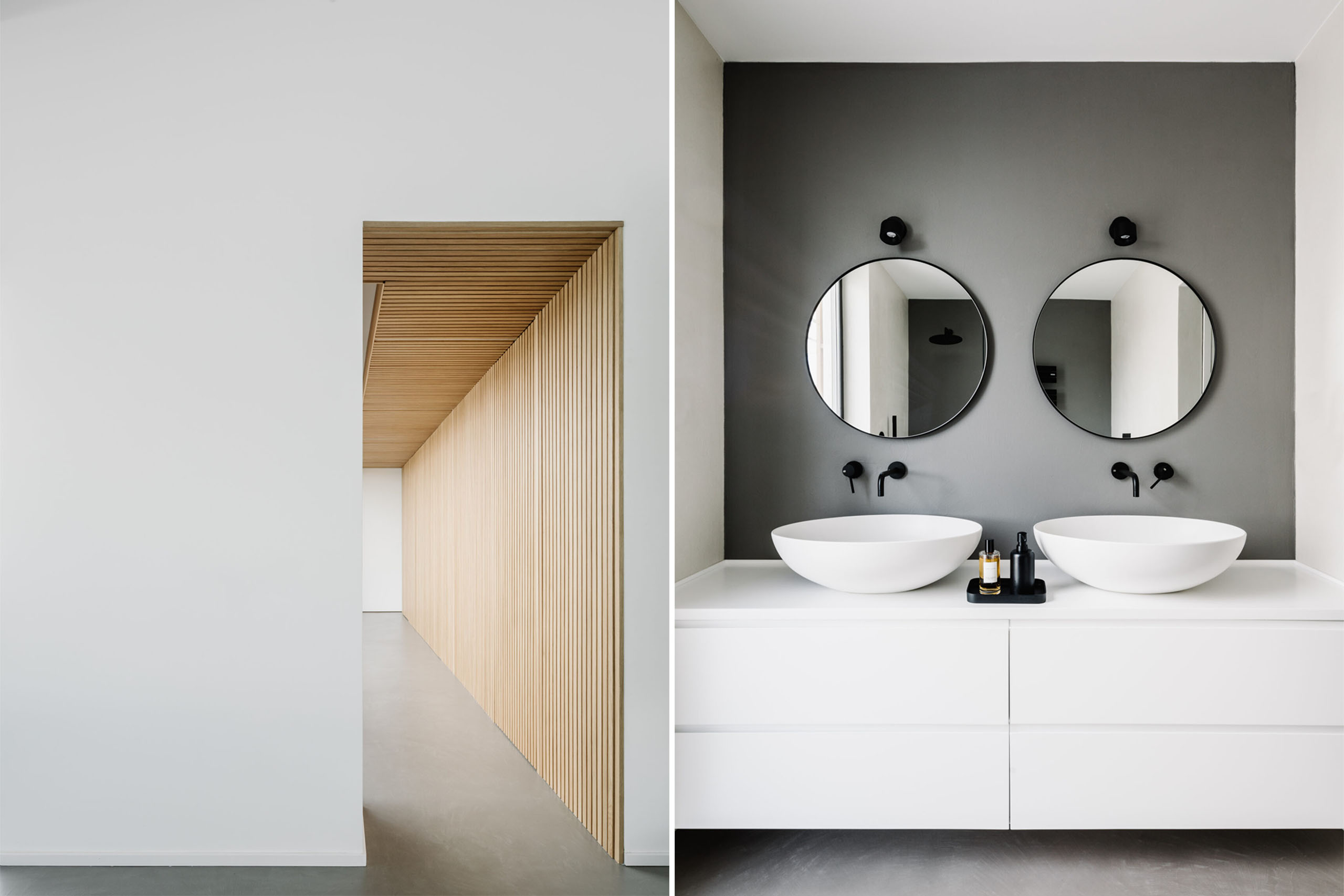 Particolare rilevanza è stata data al portoncino blindato, anch’esso rivestito da listelli a scomparsa nella parete.