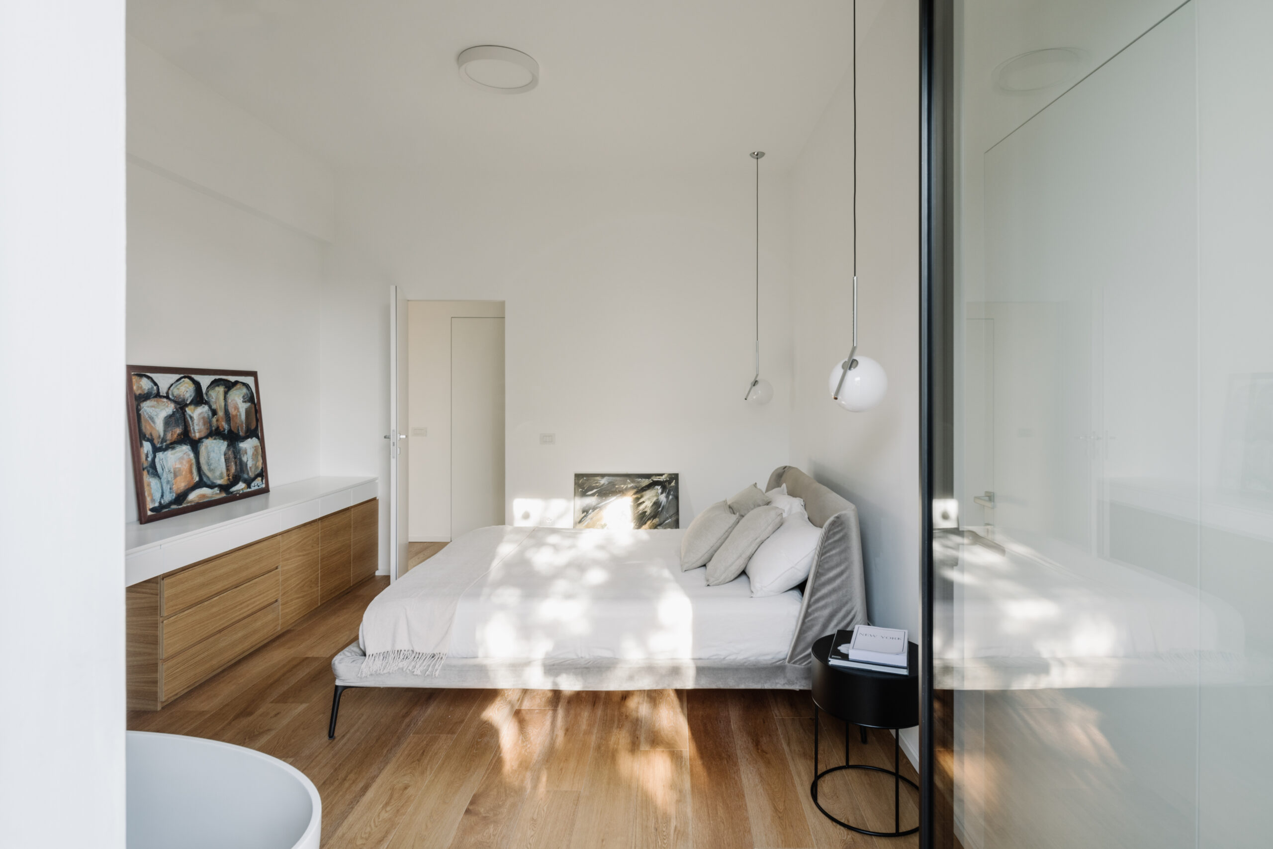 Abbiamo realizzato una boiserie di rivestimento, nella quale si nascondono due porte a filo parete senza maniglie e quattro ante di un armadio contenitivo.