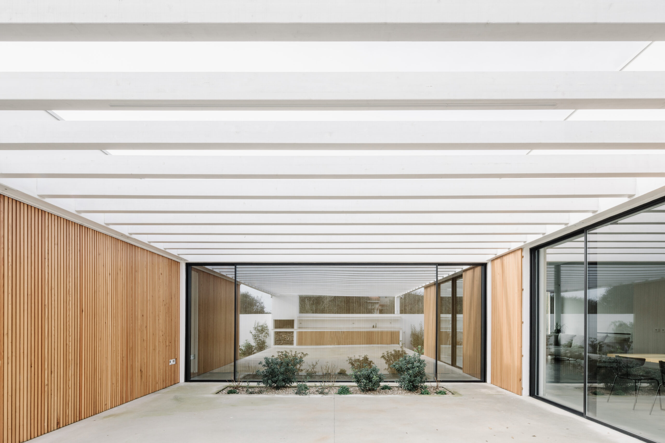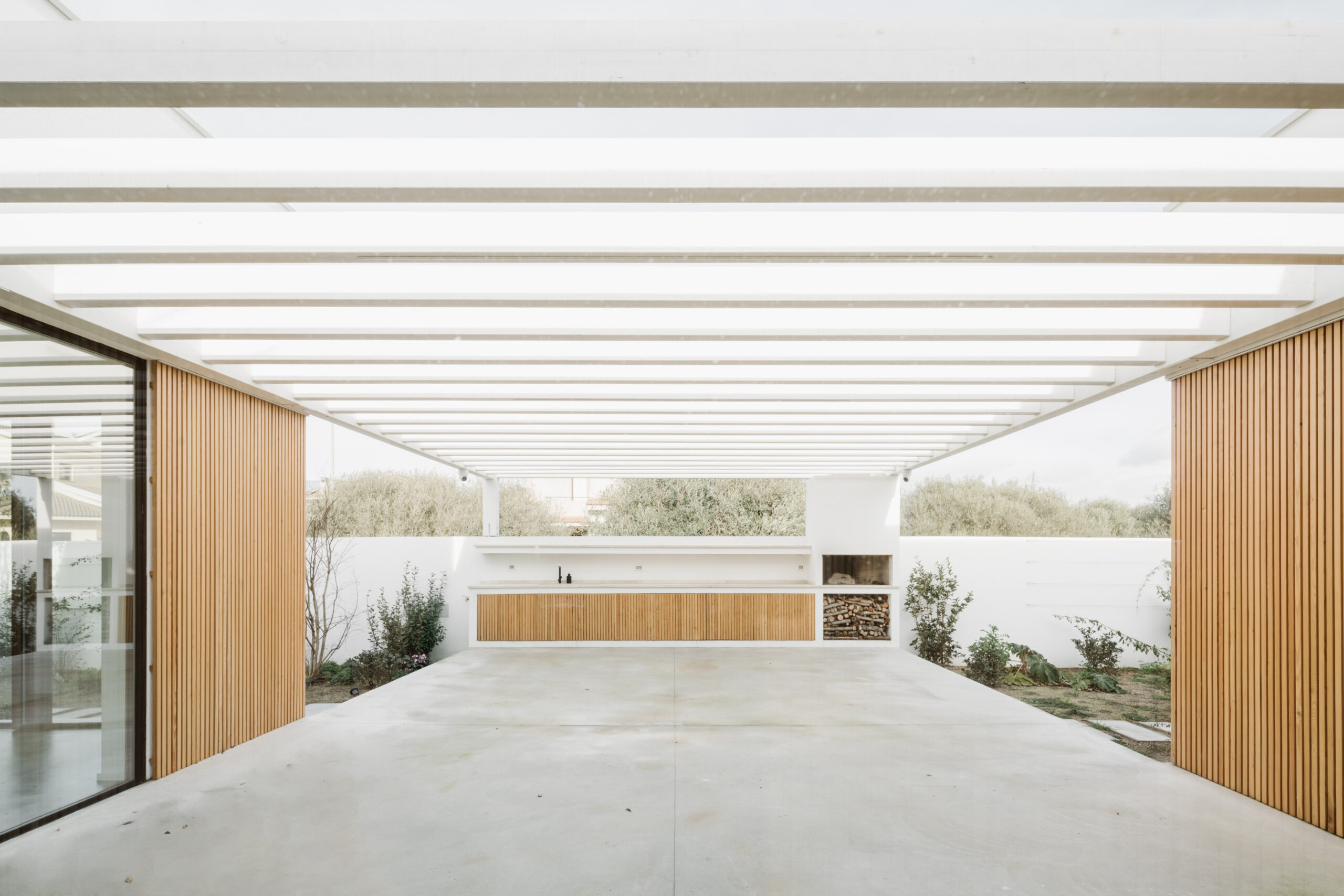 Sotto un pergolato di lamellare di Abete laccato bianco, composto da travi portanti a parete con montaggio a filo, la zona barbecue con chiusure ad ante a scomparsa, in continuità con la parete di listelli.